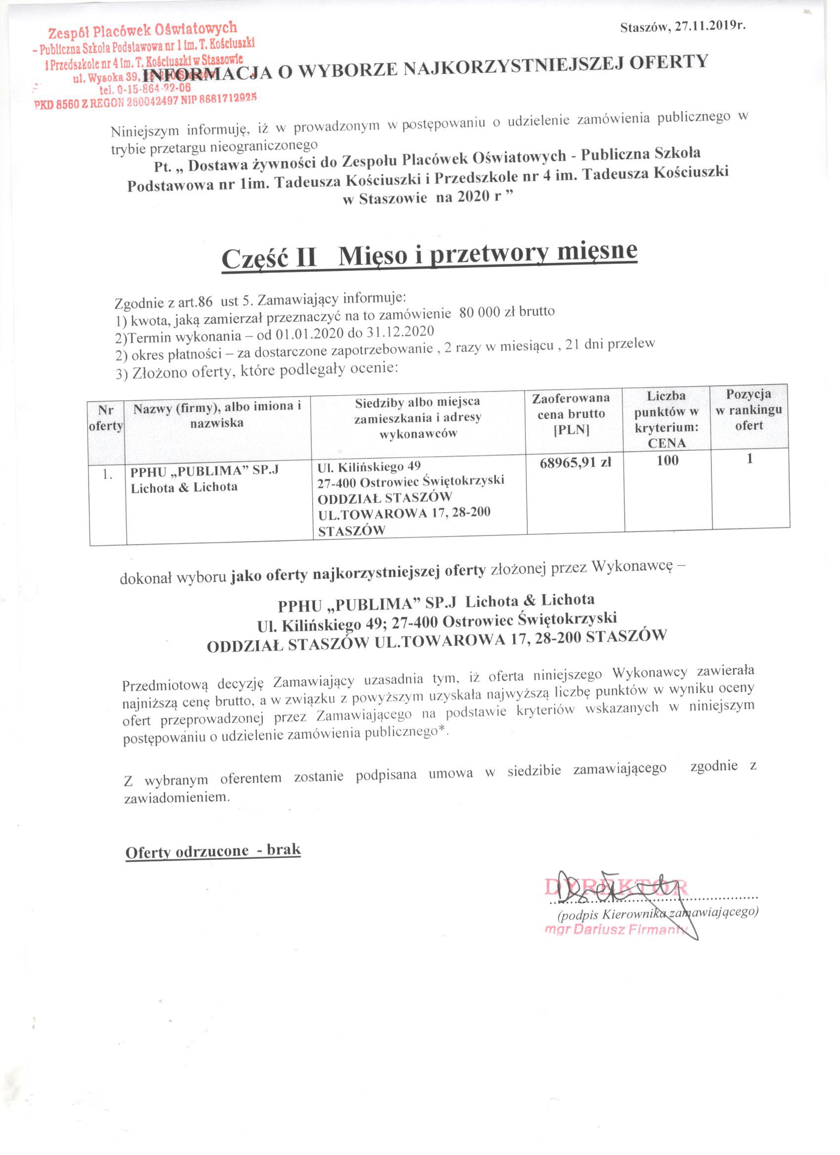 Pt. „ Dostawa żywności do Zespołu Placówek Oświatowych - Publiczna Szkoła Podstawowa nr 1im. Tadeusza Kościuszki i Przedszkole nr 4 im. Tadeusza Kościuszki